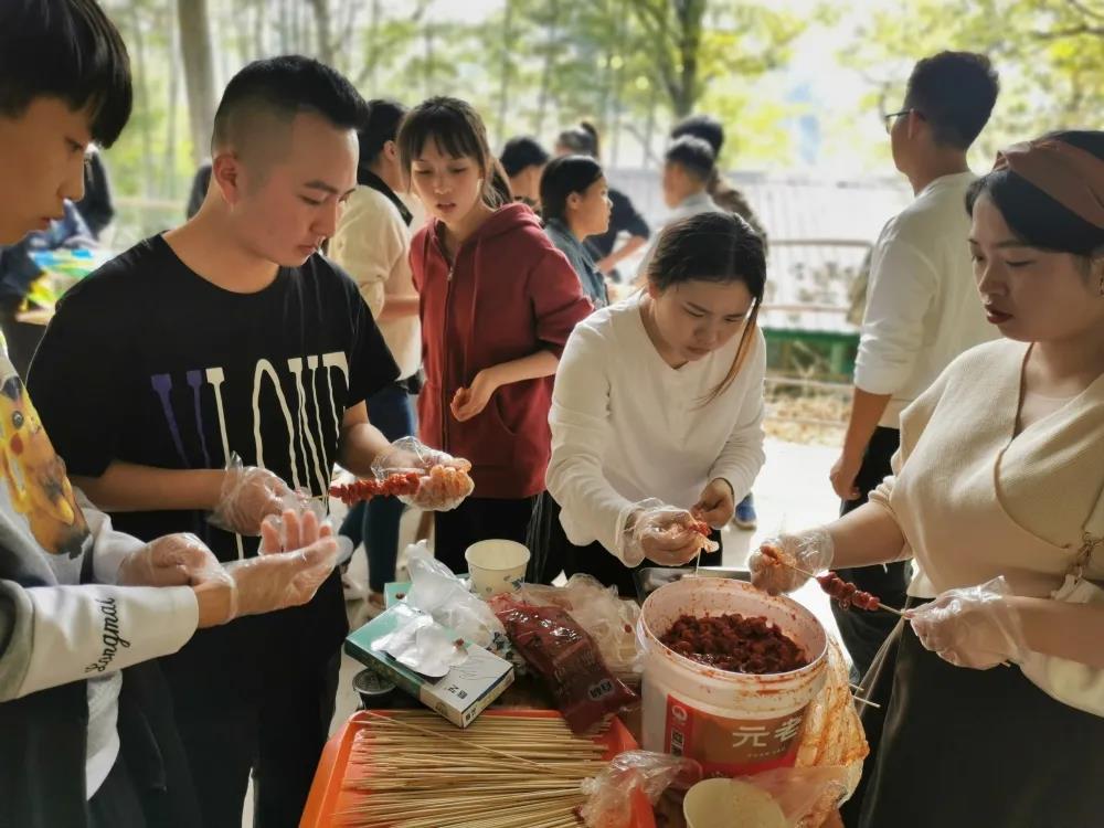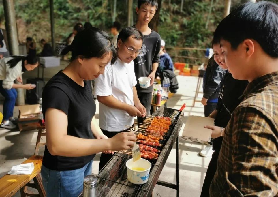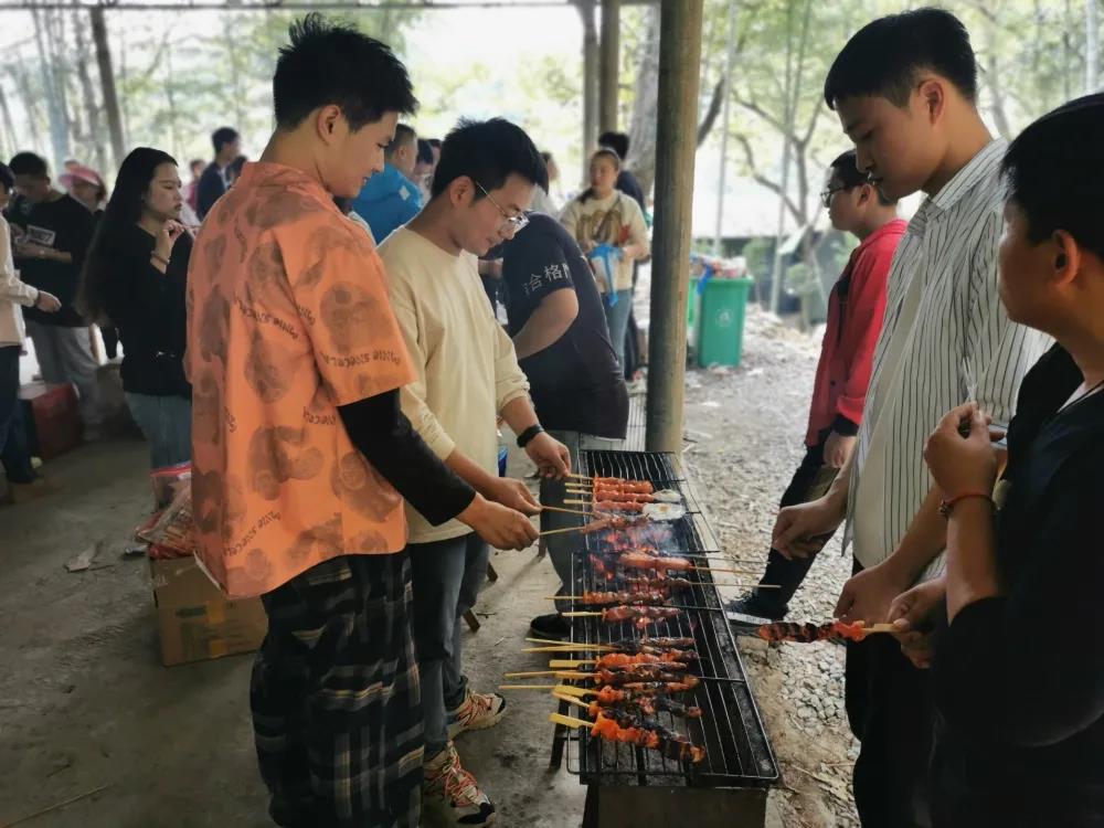 忙碌而充實的上午稍縱即逝,中午開始享受午餐,午餐準備的是燒烤,配有小吃、水果、飲料、炒菜與米飯。大家自己動手,分工明確,有穿肉串的,有刷油撒作料的,配合默契,隊伍里有燒烤達人,也有菜鳥小白,大家彼此相互借鑒學習燒烤經(jīng)驗,吃貨們也被彌漫周圍的燒烤香味引得口水直流,你嬉我笑,同事間的情誼隨著縷縷炊煙逐漸升華。