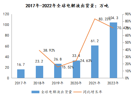 鋰電池電解液產(chǎn)業(yè)的迅速擴大來源于新能源汽車的迅猛發(fā)展,同時儲能鋰電池逐漸步入規(guī)?;l(fā)展階段,新興消費電子領(lǐng)域鋰電池需求持續(xù)提升,也顯著刺激鋰電池電解液出貨量的增長。根據(jù)高工產(chǎn)研鋰電研究所調(diào)研數(shù)據(jù)顯示,2022年全球電解液出貨量達到104.3萬噸,同比增長70.42%,市場規(guī)模達到146.73億美元。